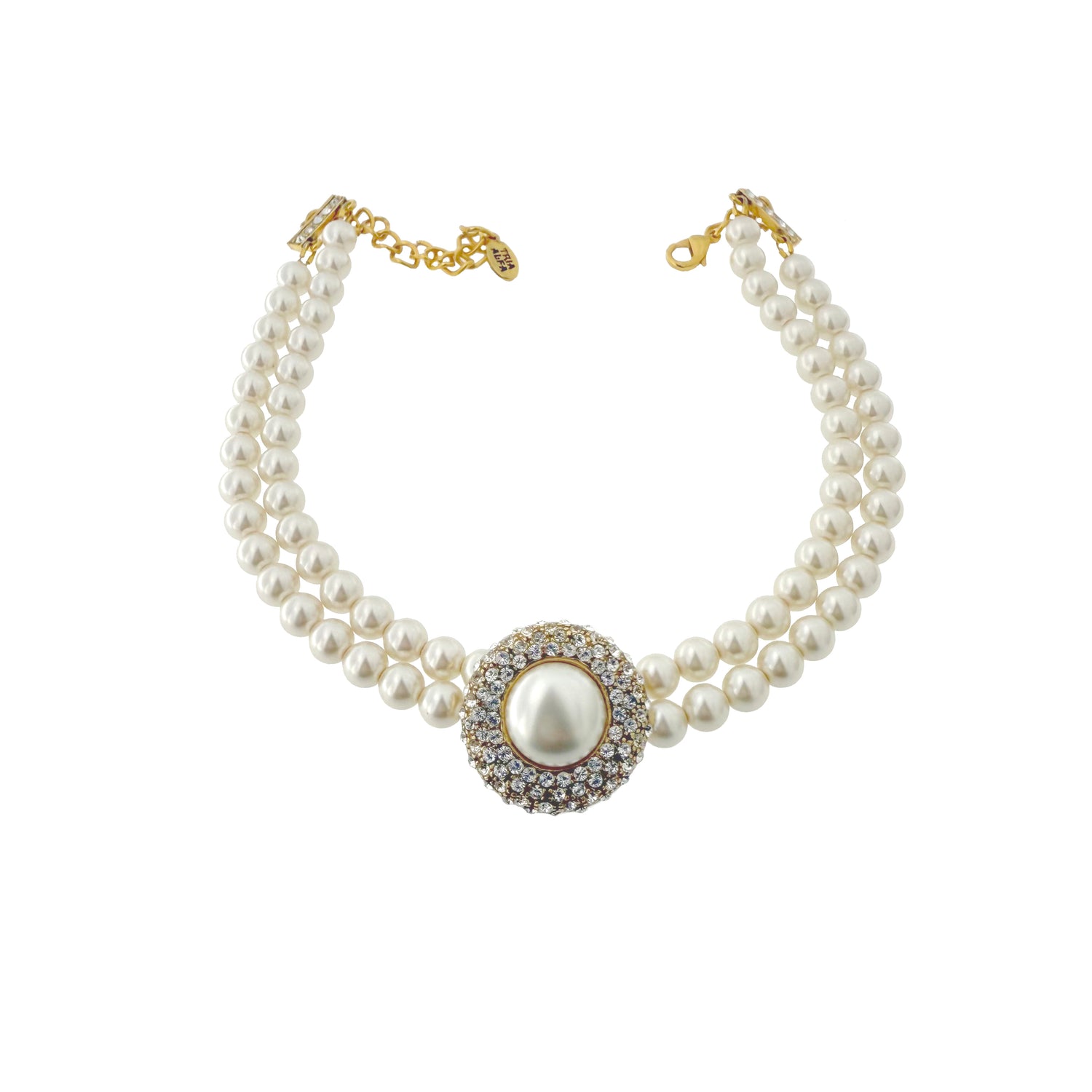 Colierul dublu cu perle tip choker reinterpretat Tria Alfa , in care cele două șiraguri sunt unite de un medalion de inspiratie vintage Coco Chanel, dar adaptat stilului contemporan. ll poți purta cu o rochie neagră, dar și in tinute de zi casual, pentru a da acea nota de eleganta clasica.