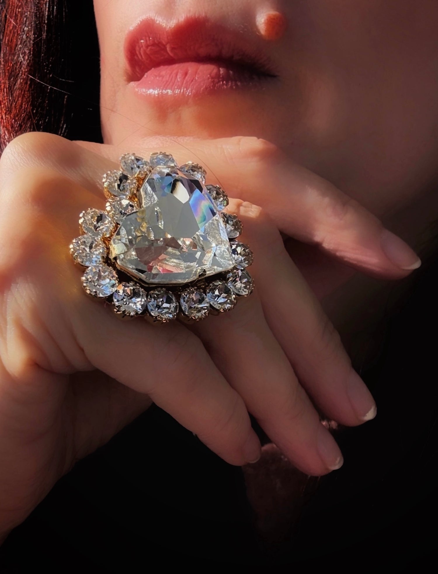 Inelul Amorina pune in valoare un cristal transparent in forma de inima, incadrat de o rama stralucitoare de cristale. Un inel statement, elegant si luminos, creat pentru aparitii speciale si accente glam care atrag privirea.